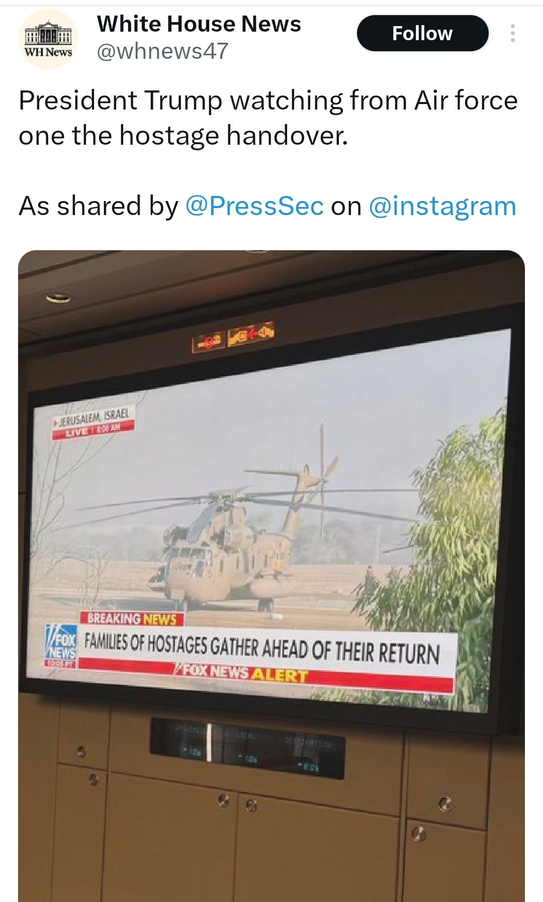 ترامب يشاهد من طائرة الرئاسة لحظة إفراج حماس عن الرهائن الإسرائيليين في غزة