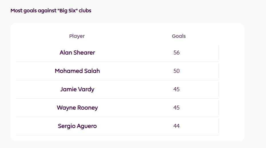 ووفقًا للموقع الرسمي لمسابقة الدوري الإنجليزي الممتاز “البريميرليج”، يتفوق محمد صلاح على جيمي فاردي الذي سجل 45 هدفاً في شباك الـ 6 الكبار متساويًا مع واين روني، كما يتفوق “الملك المصري” على سيرجيو أجويرو نجم مانشستر سيتي المعتزل صاحب الـ 44 هدفاً.