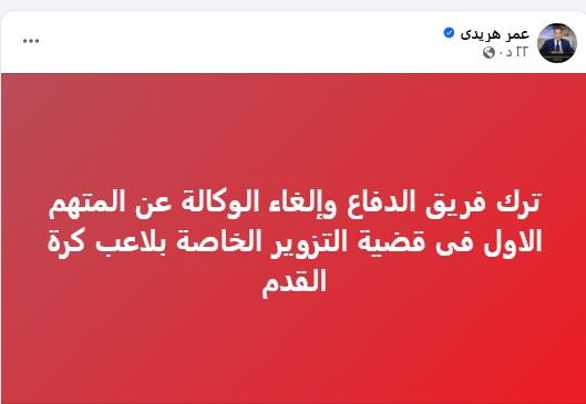 «ترك فريق الدفاع وإلغاء الوكالة عن المتهم الأول في قضية التزوير الخاصة بلاعب كرة القدم»، دون الإشارة إلى أي تفاصيل حول أسباب انسحابه.
