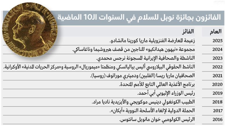 وقال المتخصص في جائزة نوبل للسلام، المؤرخ أسلي سفين لوكالة «فرانس برس»، إن ترامب «يكره مادورو»، لافتاً إلى أنه «يقصف مراكب الصيد التي يشتبه بأنها تنقل مخدرات، وسيجد بالتالي صعوبة في مهاجمة هذه الجائزة». وشنت إدارة ترامب إلى الآن ضربات على أربعة قوارب على الأقل قالت إنها تستخدم لتهريب المخدرات في البحر الكاريبي، ما أوقع ما لا يقل عن 21 قتيلاً بالإجمال، في حين ندد مادورو بـ«عدوان مسلح».