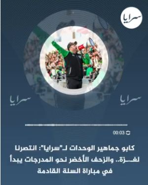 كابو جماهير الوحدات انتصرنا لغـزة .. والزحف الأخضر نحو المدرجات يبدأ في مباراة السلة القادمة - فيديو - تواصل نيوز, اليوم الأحد 12 أكتوبر 2025 10:39 مساءً
