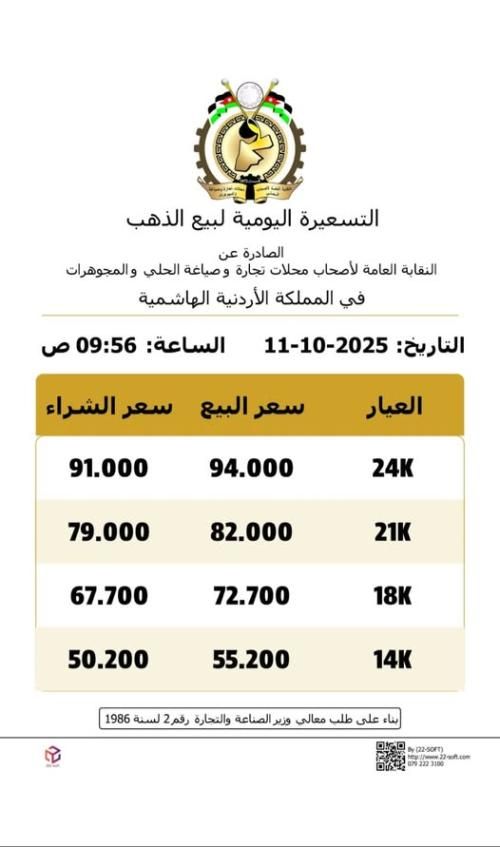 وبحسب التسعيرة الأحدث، ارتفع سعر غرام الذهب من عيار 21 – وهو الأكثر تداوُلًا بين الأردنيين – بمقدار 1.2 دينار للغرام الواحد، ليبلغ 82 دينارًا للبيع و79 دينارًا للشراء، بعد أن كان في التسعيرة السابقة 80.8 دينارًا للبيع و77.8 دينارًا للشراء.