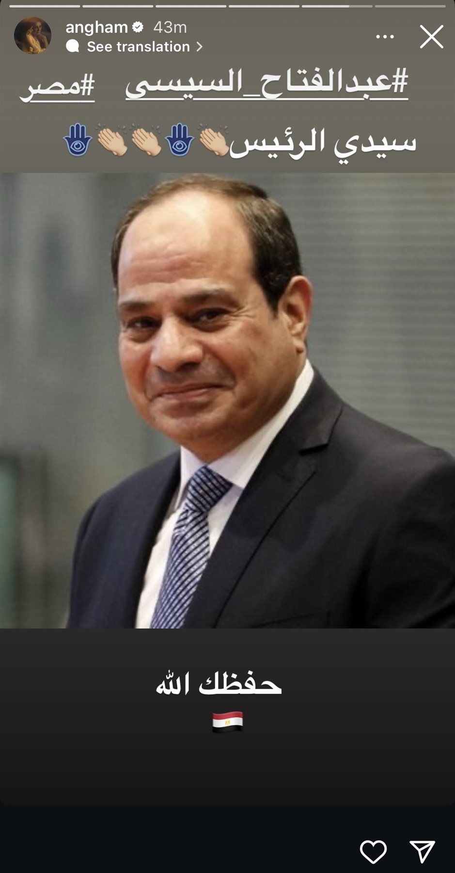 وشاركت الفنانة أنغام، صورة للرئيس عبد الفتاح السيسي، وفقا لما رصده موقع تحيا مصر، عبر خاصية استوري صفحتها الرسمية على موقع التواصل الاجتماعي إنستجرام، وعلقا عليها: سيدي الرئيس حفظك الله.