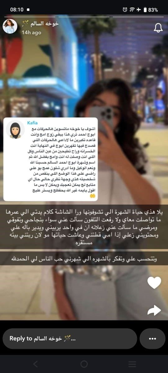 ووجهت جدّة خلود أحمد السالم، عبر حسابها في سناب شات، نصيحة لحفيدتها التي تعيش منفصلة عن والدها، بضرورة الانتباه لطريقة تعاملها مع زوج والدتها، معتبرة أن بعض تصرفاتها قد تقلل من احترام والدها أمام الناس وتضعها في موقف محرج، محذرة من أن هذه التصرفات قد تضر بسمعتها وسمعة العائلة.