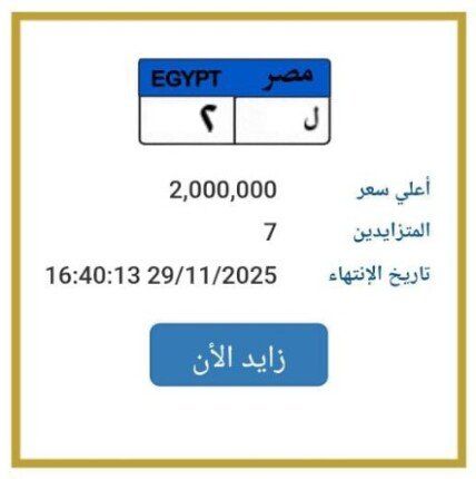 أعلنت بوابة مرور مصر الإلكترونية، المزايدة على لوحة معدنية مميزة للسيارات، وصل سعرها إلى 2 مليون جنيه، وتحمل رقم «ل 2»، ويتزايد عليها حتى الآن 7 أشخاص، ومن المقرر أن تنتهي المزايدة عليها غدًا السبت 29 نوفمبر 2025.