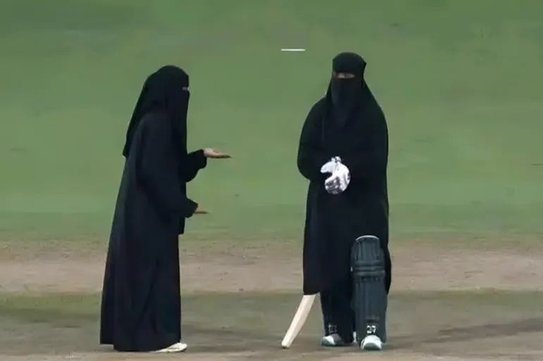 وتظهر الصورة لاعبتين ترتديان النقاب داخل ملعب كريكيت، ويظهر في أسفلها شريط معلومات المباراة كما في النقل التلفزيوني الرسمي، يشير إلى أن منتخب بنغلاديش سجل 7 نقاط دون خسارة أمام نيوزيلندا بعد 3 جولات.