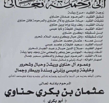 وأعلنت ميادة الحناوي، عبر حسابها الرسمي بموقع التواصل الاجتماعي «فيسبوك» عن وفاة شقيقها، قائلة: «أخي عثمان، رفيق دربي وسندي في الحياة، يا من فارقتني ورحلت إلى جوار ربك، لقد خلّفت وراءك الكثير من الأشواق والأحزان، تركتها بحجمٍ لا تُنهيه السنين، ذكراك محفورة في القلب والعقل إلى الأبد، نسأل الله أن يرحمك ويغفر لك وللجميع، إنا لله وإنا إليه راجعون، ولا حول ولا قوة إلا بالله، قدر الله وما شاء فعل».