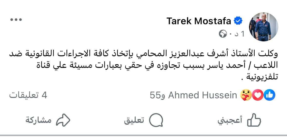 وكتب طارق مصطفى"وكلت الأستاذ أشرف عبدالعزيز المحامي بإتخاذ كافة الاجراءات القانونية ضد اللاعب / أحمد ياسر بسبب تجاوزه في حقي بعبارات مسيئة علي قناة تلفزيونية".