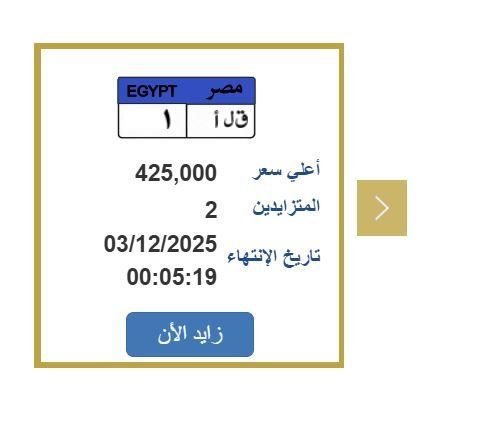أعلنت بوابة مرور مصر الإلكترونية، المزايدة على لوحة معدنية مميزة للسيارات، وصل سعرها إلى 425 ألف جنيه، وتحمل رقم «ق ل أ 1»، ويتزايد عليها حتى الآن شخصان، ومن المقرر أن تنتهي المزايدة عليها يوم الأربعاء 3 ديسمبر 2025.