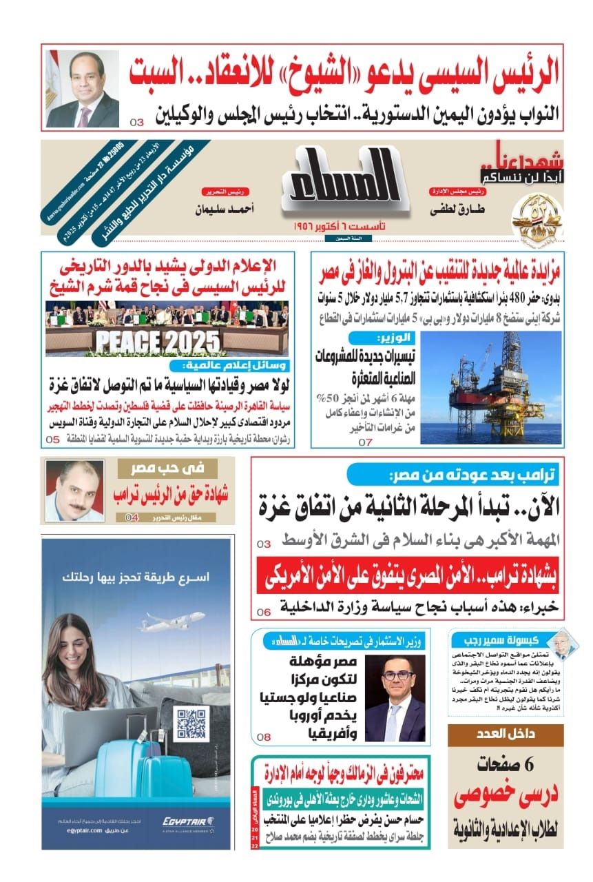 عدد المساء الصادر اليوم الأربعاء 15 أكتوبر - تواصل نيوز, اليوم الأربعاء 15 أكتوبر 2025 04:39 صباحاً