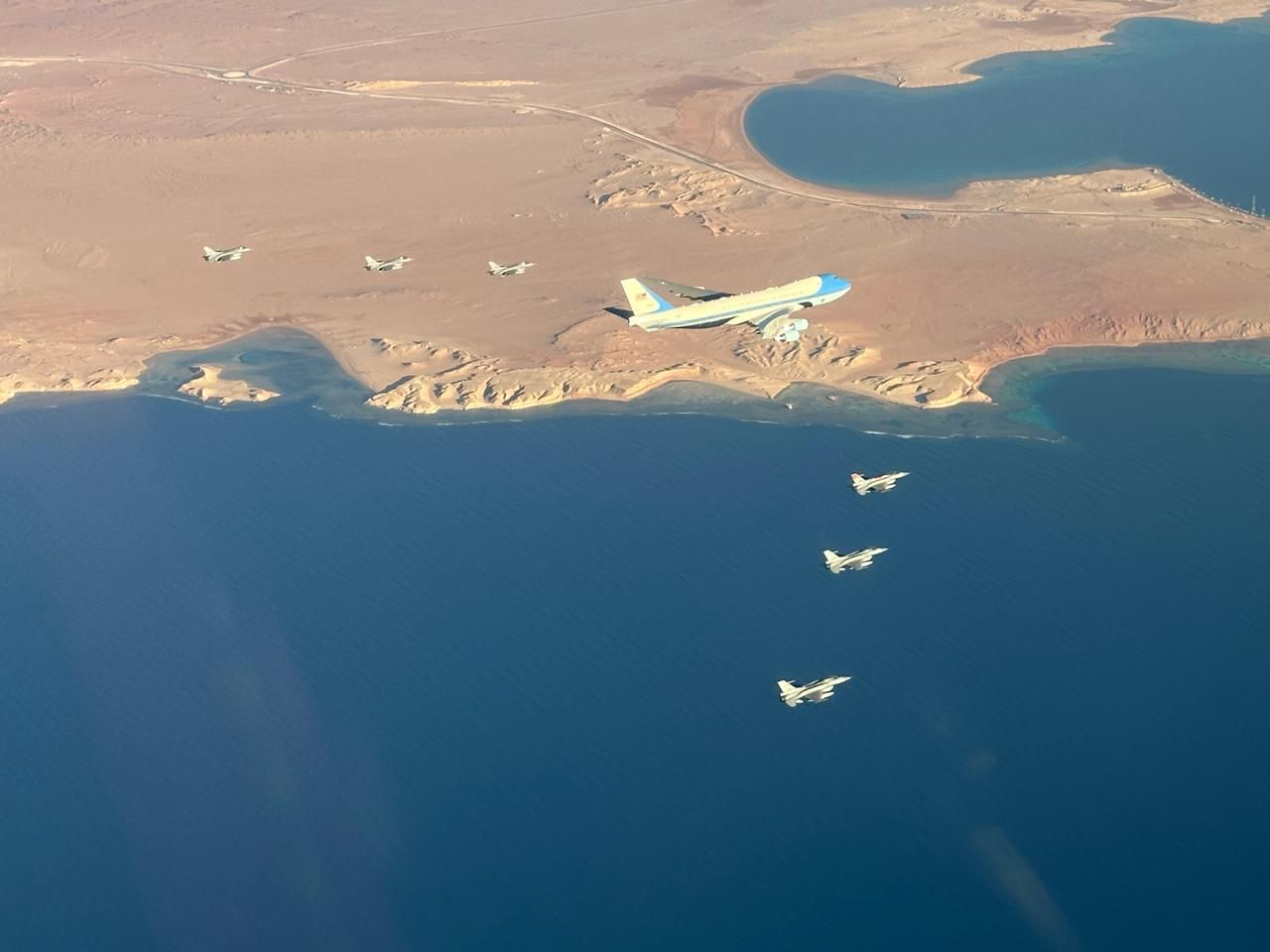 وتضمن الفيديو لقطات ترصد لحظة دخول طائرة الرئاسة الأمريكية المجال الجوي المصري، حيث قامت مجموعة من الطائرات المقاتلة المصرية بمرافقتها في مشهد يعكس مستوى الجاهزية والاحترافية التي تتميز بها القوات الجوية المصرية.