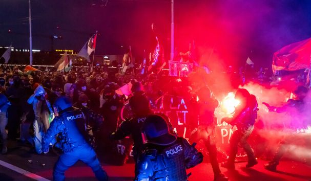وقالت هيئة الإذاعة والتلفزيون السويسرية إن الشرطة ردّت باستخدام الغاز المسيل للدموع ومدافع المياه لتفريق المتظاهرين، مؤكدة أن شخصًا واحدًا على الأقل تم توقيفه.