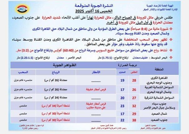 الظواهر الجوية المتوقعة اليوم الخميس 16 أكتوبر 2025
