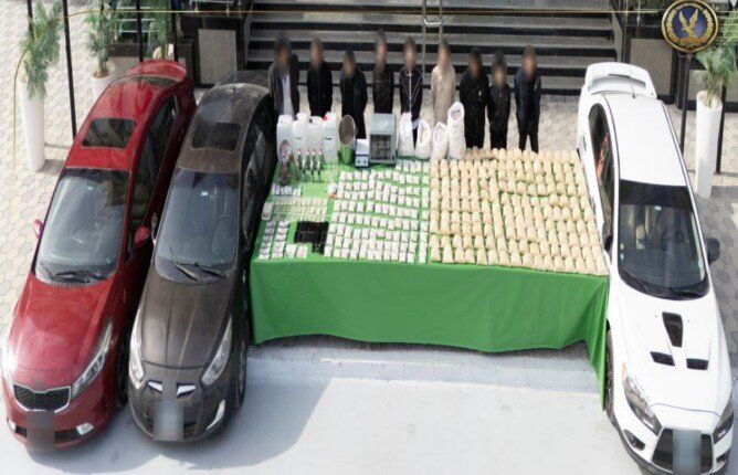 عقب تقنين الإجراءات تم استهدافهم وإعداد الأكمنة اللازمة لهم وضبطهم وبحوزتهم (94 كيلو جرام من مخدر الحشيش الاصطناعي - كميات كبيرة من المواد الخام المستخدمة في خلط وتهيئة المواد المخدرة - الأدوات المستخدمة في التصنيع - "3 سيارات، مبالغ مالية عملات محلية وأجنبية " من متحصلات نشاطهم الإجرامي - 17 هاتف محمول)