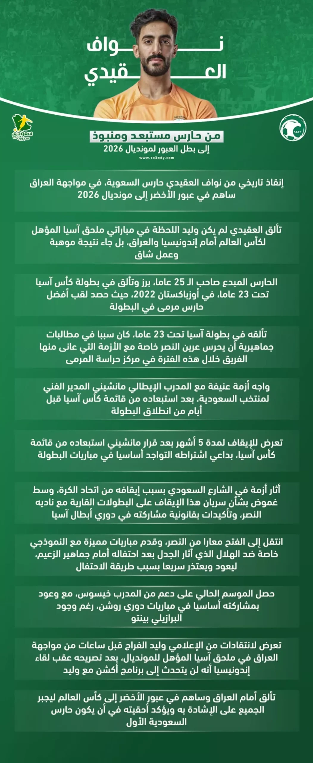 تواصل نيوز - إنقاذ تاريخي من نواف العقيدي حارس السعوية، في مواجهة العراق ساهم في عبور الأخضر إلى مونديال 2026.