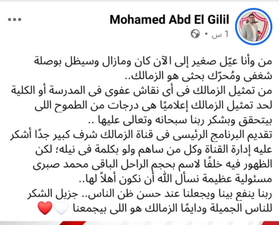 وأعلن عبدالجليل عن مشاعره لأول مرة بعد توليه المهمة، مؤكداً عبر صفحته الشخصية على موقع “فيس بوك” أن ارتباطه بالزمالك يمتد منذ طفولته وحتى اليوم، حيث كان النادي دائمًا مصدر شغفه ومحرك طموحه.
