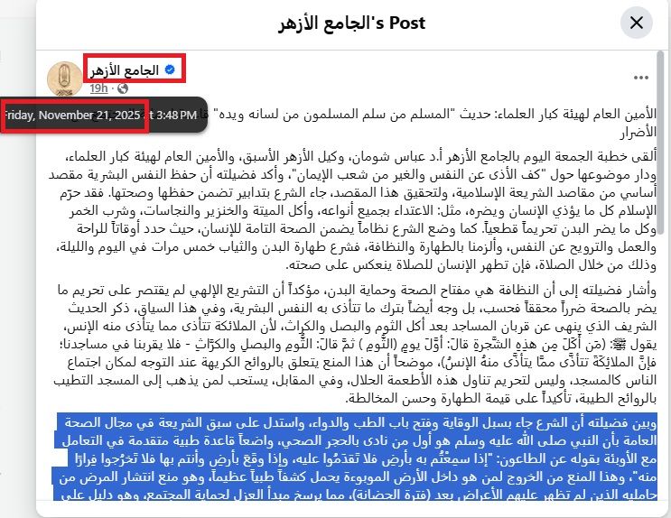 ونشرت قناة على يوتيوب شعائر صلاة الجمعة كاملة، بعنوان: "شعائر صلاة الجمعه اليوم 21-11-2025 الجامع الازهر الشريف - بث مباشر". ويظهر فيها الحديث عن وجوب الوقاية وحماية المجتمع، إذا كان الفرد مريضا، ابتداء من الدقيقة 48:56.